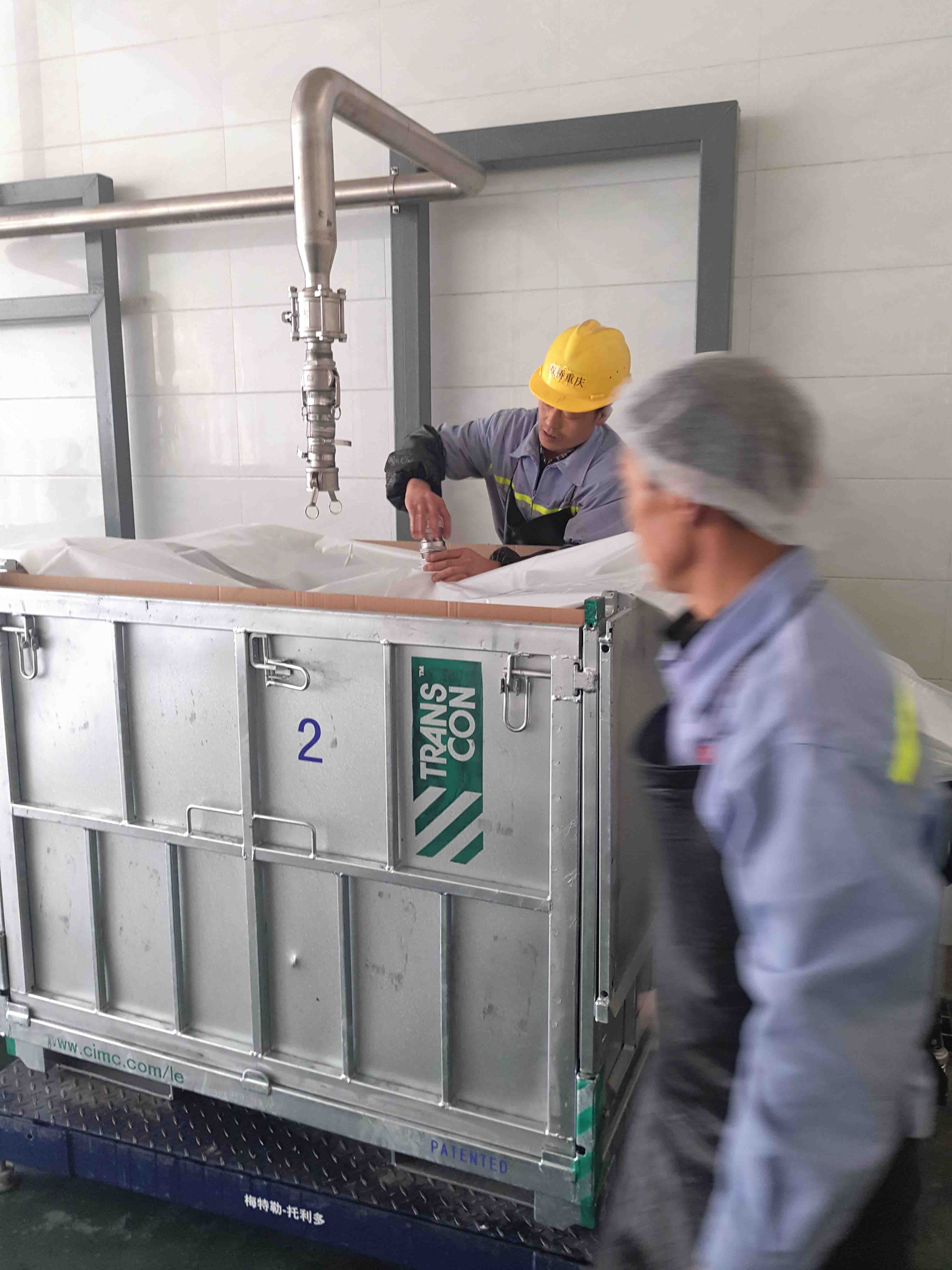 打開內(nèi)襯袋口蓋,與排料泵軟管鏈接后進(jìn)行排料。