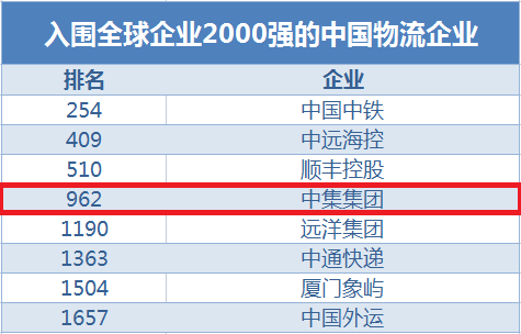 有8家中國(guó)物流企業(yè)入圍,中鐵位居全球254名,中遠(yuǎn)海控409名,順豐510名,中集集團(tuán)962名,其余入圍企業(yè)還有遠(yuǎn)洋集團(tuán)、中通快遞、廈門象嶼、中國(guó)外運(yùn),具體排名如下表所示: