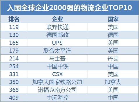 在入圍福布斯全球企業(yè)2000強(qiáng)的物流企業(yè)中,美國(guó)聯(lián)邦快遞居于首位,全球排名第119。全球前十的物流企業(yè)榜單如下表所示: