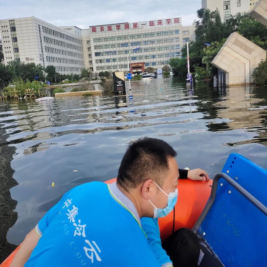 中集冷云鄭州分公司員工危進喜、王自偉立刻從鄭州出發(fā),先后通過開車,步行,皮劃艇,終于快到醫(yī)學院大門。此刻,醫(yī)院門口的學院西路儼然已是一條河流,紅色、藍色、黑色等各類皮劃艇來往穿梭。